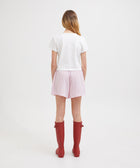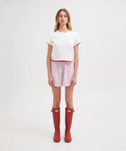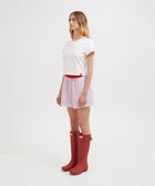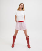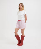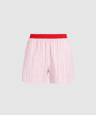 A fun light-weight short, cut from airy tencel blend fabrication. Featured in a multi-colour stripe, finished with a contrast solid red elasticated waistband. Wear with the matching shirt or classic tank. These will easily become your go to shorts in summer.