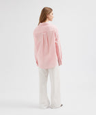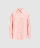 Crafted from a light-weight ramie-cotton blend. Features include a front pocket and buttoned cuffs. Subtle red stitching adds a pop of colour. Available in pink, white and chocolate.